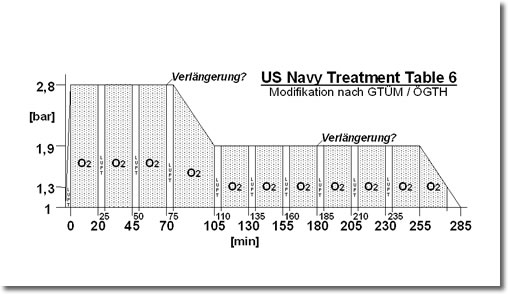 Der Behandlungsdruck von 2,8 bar (280 kPa, entspr. 18 Meter Wassertiefe) und die Gesamtzeit der Sauerstoffatmung unter Druck sind dabei aber deckungsgleich. Abgebildet ist die Modifikation der GTÜM / ÖGTH.